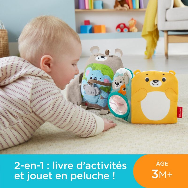 Mon Livre Peluche d’Activités de Fisher-Price® offre à bébé l’occasion d’exercer ses sens en «lisant» une histoire passionnante. Ce livre en tissu doux comporte 5 pages sur le thème des animaux, chacune proposant une activité sensorielle. Le livre tient debout tout seul pour que bébé puisse l’explorer en se redressant lorsqu’il est allongé sur le ventre, tandis que l’ours en peluche est un copain idéal pour faire des câlins. Avec une page qui crisse et un grand miroir pour découvrir son reflet, sans oublier la feuille qui cache une surprise et le koala à mordiller, ce livre d’activités tout doux et la peluche qui l’accompagne vont occuper bébé et lui offrir des moments de tendresse et de découverte.