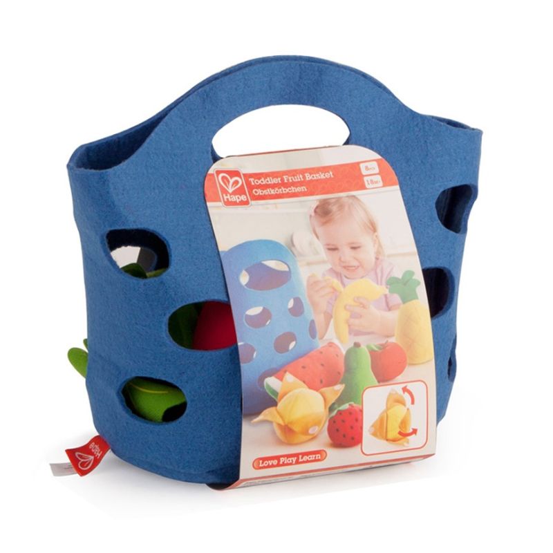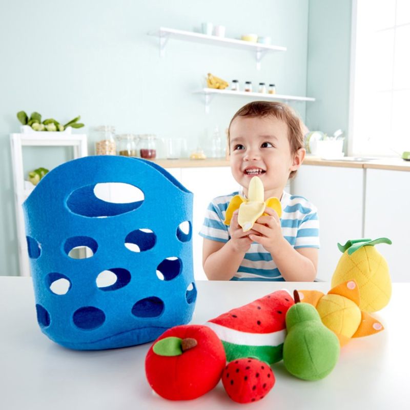 Remplissez ce doux panier en feutre avec sept de vos fruits préférés. Pelez la banane et l’orange et partagez-les avec vos amis ! Fait de matières souples permettant aux bébés de les attraper et de les tenir.