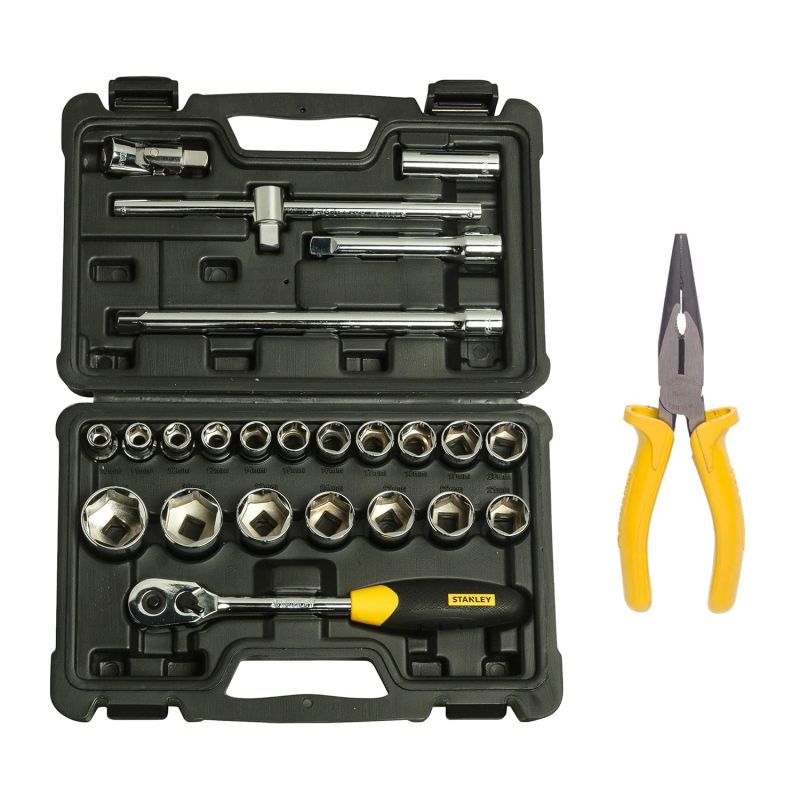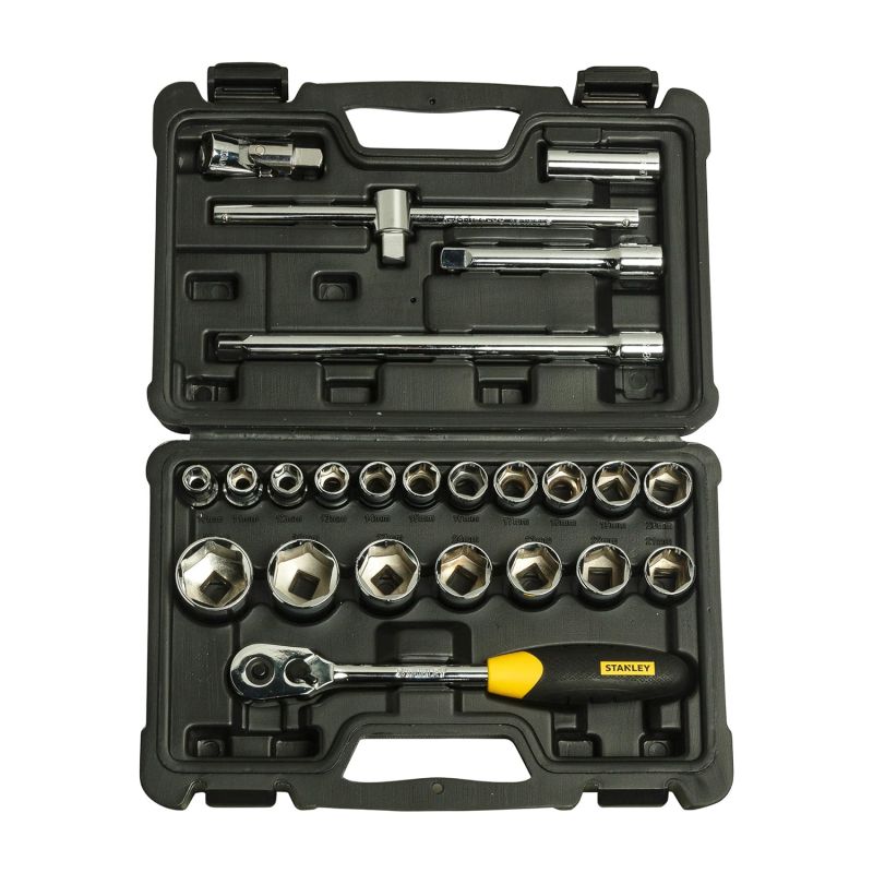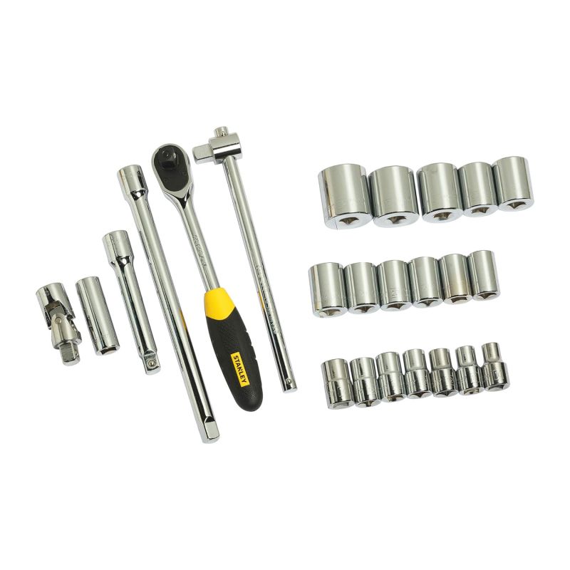 Douille de 24 pièces fabriquée en acier de haute qualité et finie en chrome hautement poli. Le mécanisme de verrouillage retient les douilles pour augmenter la sécurité pendant le travail.