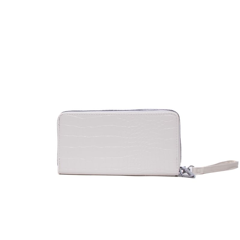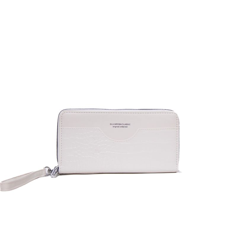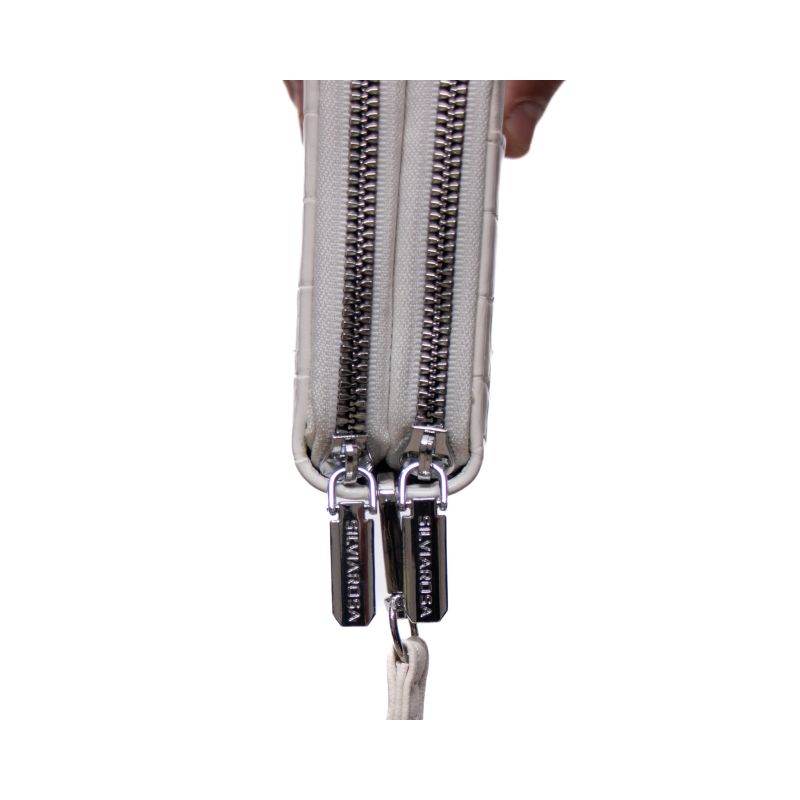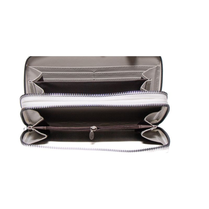 This wallet has two main compartments, each with a zipper and each compartment contains two compartments separated by a small pouch.