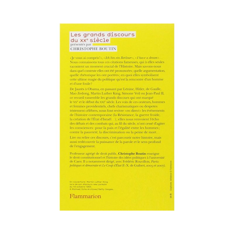 " I got you ! », « Ich bin ein Berliner », « I have a dream ».. We all know these famous quotes, which alone tell a crucial moment in history. But do we know in what context they were pronounced; what argumentation, what rhetoric brought them; how do they symbolize that ultimate magic of politics that is the meeting of a man and a crowd? From Jaurès to Obama, via Lenin, Hitler, de Gaulle, Mao Zedong, Martin Luther King, Simone Veil or Jean-Paul II, this collection brings together the great speeches that marked the 20th and the beginning of the 21st century. The voices of these speakers, providential men and women, charismatic leaders or sadly famous despots, make us relive “live” the events of contemporary history (the Resistance, the Cold War, the creation of the State of Israel. ..); they send back to us the echo of the debates and fights which, over the course of the century, have never ceased to agitate consciences: for peace and equality among men; against poverty, discrimination or the death penalty. To read or reread these speeches is to explore our history, but also to rediscover the power of words and the deep meaning of commitment.