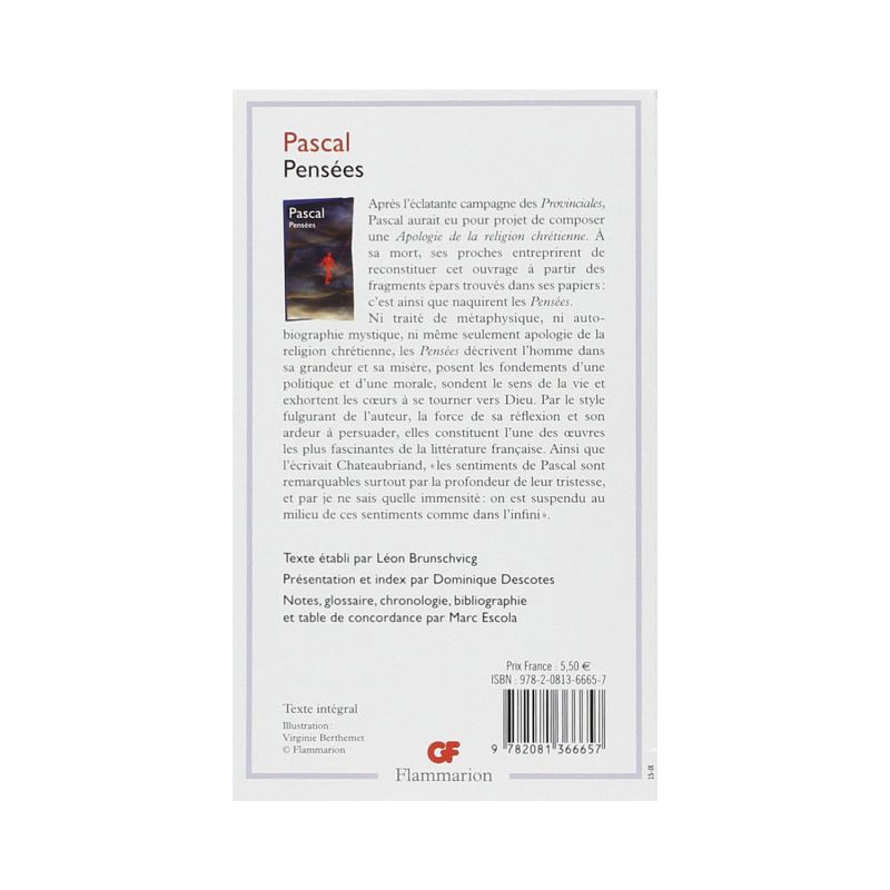 After the brilliant campaign of the Provinciales, Pascal would have had the project of composing an Apology of the Christian religion. When he died, his relatives undertook to reconstruct this work from the scattered fragments found in his papers: this is how the Pensées were born. Neither treatise on metaphysics, nor mystical autobiography, nor even just an apology for the Christian religion, the Pensées describe man in his greatness and his misery, lay the foundations of a policy and a morality, probe the meaning of life. and urge hearts to turn to God. By the dazzling style of the author, the force of his reflection and his ardor to persuade, they constitute one of the most fascinating works of French literature. As Chateaubriand wrote, “Pascal's feelings are remarkable above all for the depth of their sadness, and for I don't know what immensity: one is suspended in the midst of these feelings as if in infinity”.