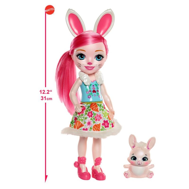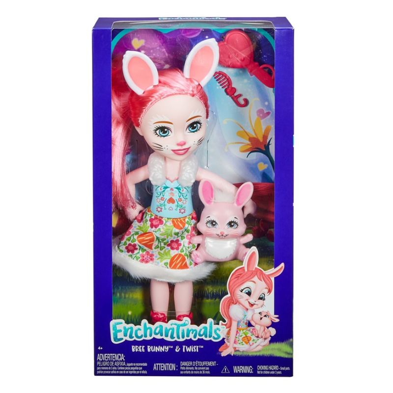 Invent fantastic stories with these adorable Enchantimal dolls and their animal friends. Each Enchantimals doll has an animal in her image with which she lives a beautiful story of friendship. These two friends spend their time together and are very similar! Choose between Felicity Renard and her friend Flick, Danessa Biche and her friend Sprint, or Bree Lapin and her friend Twist. These 30cm dolls are even bigger, with more magical details than ever, for even more exciting games! Each doll wears a colorful outfit and shoes, adorned with floral motifs and small pieces of fur. Adorable little ears reminiscent of those of her pet point to the head of each doll. Animal friends have an equally crisp look with enchanting details like golden antlers or small stuffed tails. Each pair of inseparable Enchantimals friends comes with two matching hairbrushes for moments of complicity. Children will love to recreate the special bond that unites the Enchantimals and discover their universe whose motto is "Love is everything for us". Collect all the dolls to recreate the magical world of Enchantimals and invent your own enchanted stories (sold separately; some products may not be marketed).