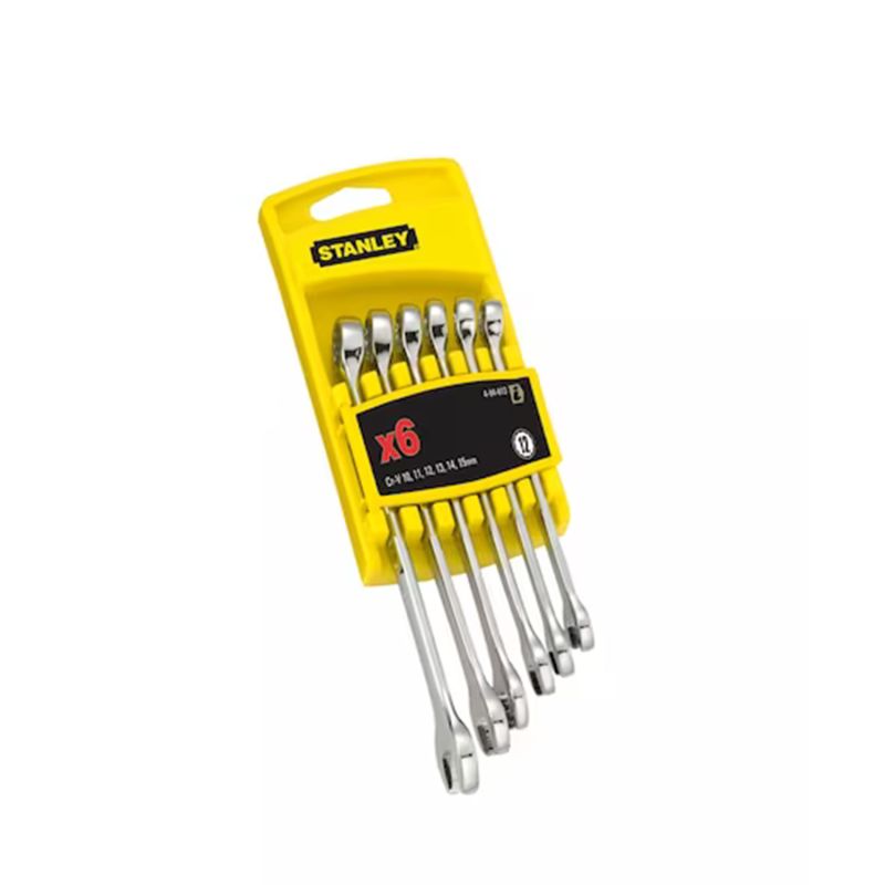 Forged from high-performance nickel-chromium plating and heat-treated, the STANLEY® Long Panel Full Chrome Finish 6-Piece Combination Wrench features a satin finish nickel-chrome coating that protects against corrosion. Stored and organized in a compact and durable holder, keeps keys tidy and organized. Complies with ISO 3318 DIN 3113. Set of 6 pieces: 10, 11, 12, 13, 14 and 15 mm.