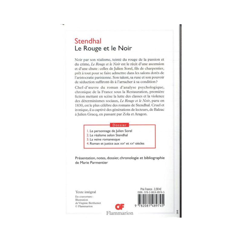 Black in its realism, tinged with the red of passion and crime, Le Rouge et le Noir is the story of a rise and a fall: those of Julien Sorel, the son of a carpenter, ready to do anything to get himself admitted into the gilded salons of the Parisian aristocracy. Will his talent, his cunning and his power of seduction be enough to tear him from his condition? Masterpiece of the novel of psychological analysis, chronicle of France under the Restoration, the first fiction depicting the class struggle and the violence of social determinisms, Le Rouge et le Noir, published in 1830, is the most famous novels by Stendhal. Cruel and ironic, it has captivated generations of readers, from Balzac to Julien Gracq, via Zola and Aragon.
