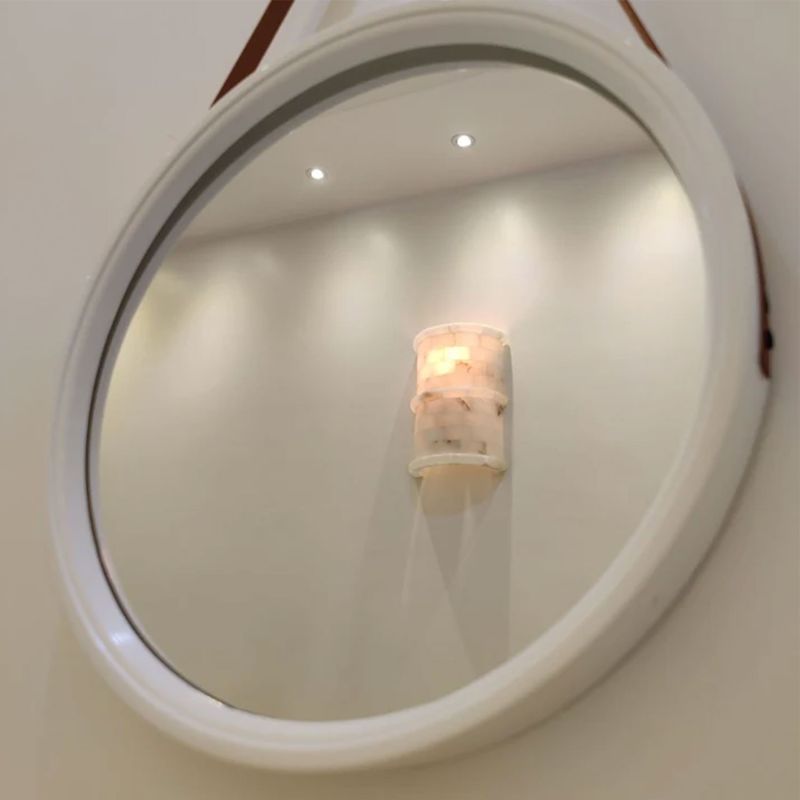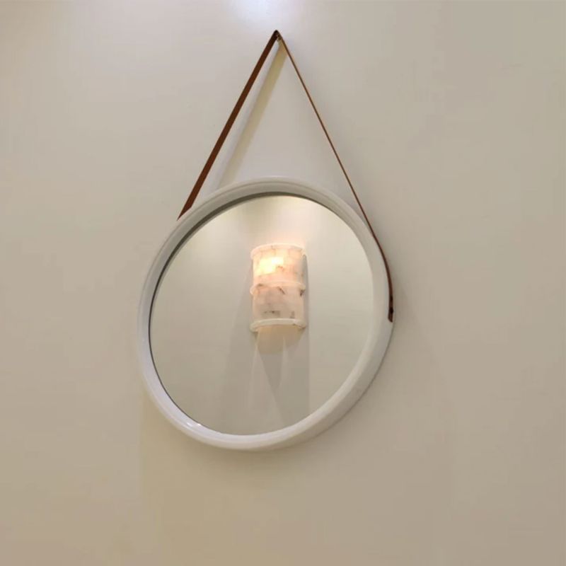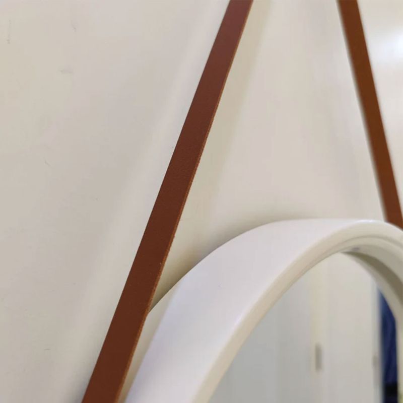 The round mirror is framed in durable soft plastic, suspended from a peg by a smooth and soft-touch faux leather strap. The strap allows the mirror to be adjusted to the desired height, which adds greater flexibility to this decoration.
