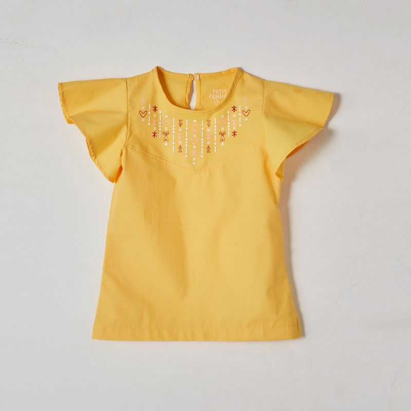 Add a touch of color and style to your little girl's wardrobe with this saffron yellow flared sleeve blouse made of 100% cotton poplin. Combining comfort, quality and charming aesthetics, it will be a perfect choice for all occasions.