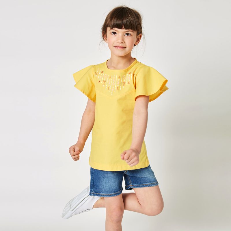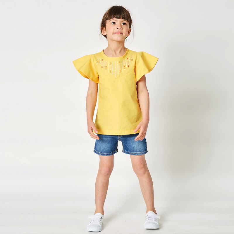 The design of this blouse highlights flared sleeves that bring a touch of femininity and fluidity to the outfit. The bright saffron yellow color adds a note of brightness and cheerfulness to this blouse. Your little girl will be dazzling in this vibrant color.