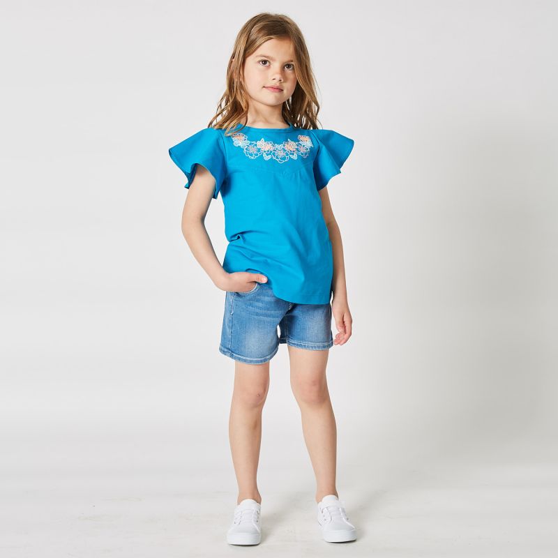 Bring a touch of style and freshness to your little girl's wardrobe with our light blue denim shorts, embellished with embroidery highlighting the charming Petit Fennec. These shorts combine comfort and elegance, with a playful touch brought by the embroidery.