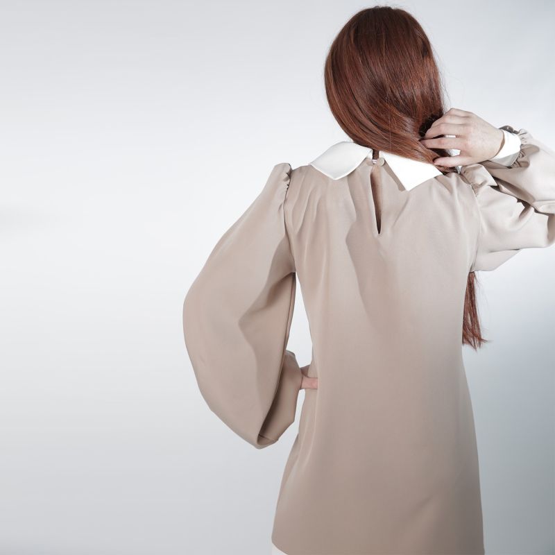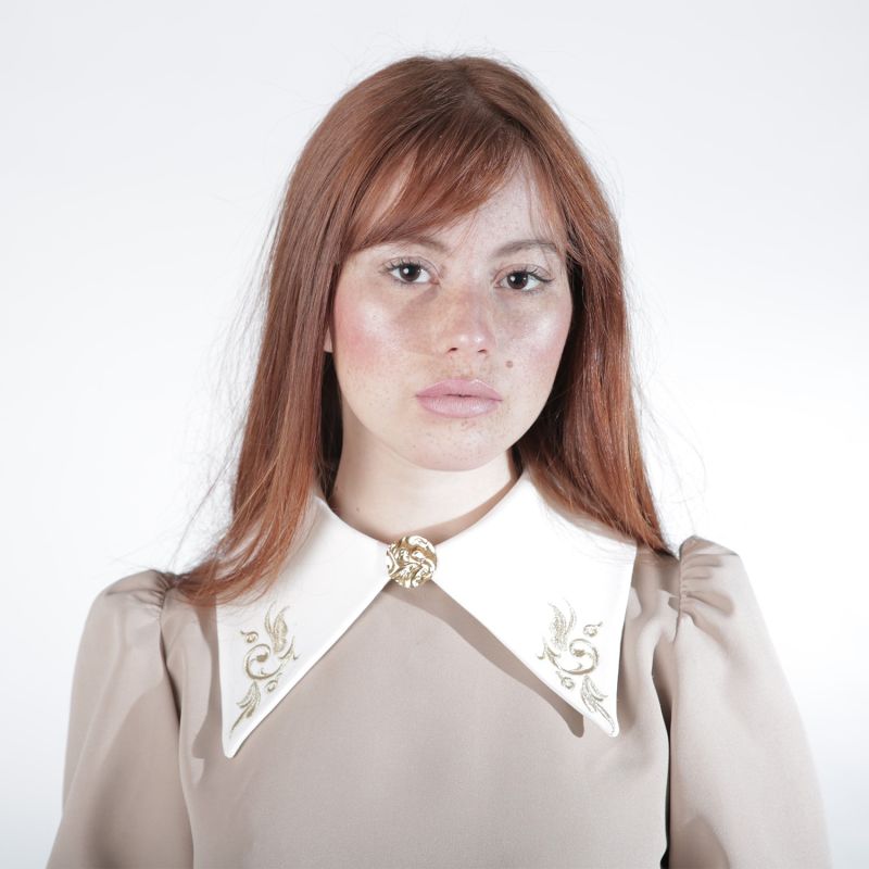 This trapeze dress from the brand Nina Bouchemit is a piece that is both sober and elegant. Its taupe beige and ecru white color easily matches different clothing styles, while the oversize collar embroidered with gold thread with design button brings a touch of originality. The balloon sleeves with puffy effect and the small opening on the back topped with a dress button add a note of sophistication. Made of stretch crepe, this dress is both comfortable and fitted to highlight the silhouette.