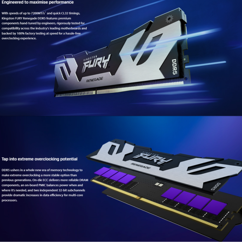 La Kingston FURY Renegade DDR5 32G (16G x 2) 6800MHz allie puissance, fiabilité et design soigné pour répondre aux besoins des utilisateurs les plus exigeants. Que vous soyez un gamer recherchant la meilleure fluidité ou un professionnel créant et manipulant des contenus lourds, ce kit de mémoire fournit la vitesse et la stabilité attendues, tout en bénéficiant du savoir-faire éprouvé de Kingston.