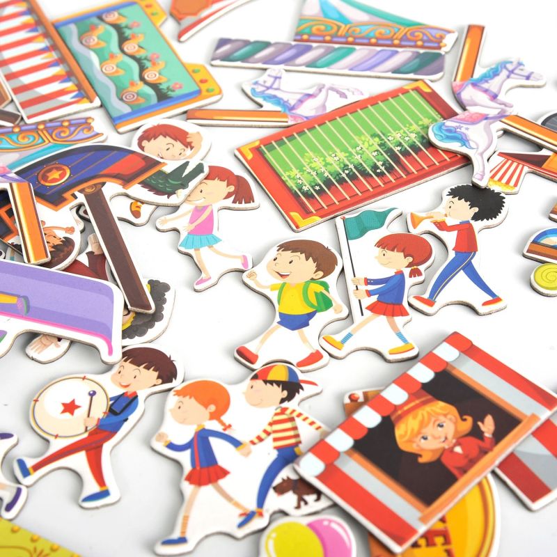 Le livre contient une sélection de figurines et d'attractions magnétiques que les enfants pourront utiliser pour créer leur propre monde à dix. Carrousels, grandes roues, stands de bonbons, machine à pop-corn et bien plus encore ; seule l'imagination est la limite !