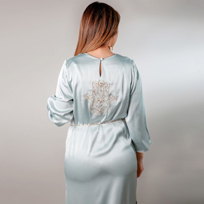 Cette robe hôtesse en satin de soie "Élégance Orientale" est parfaite pour les soirées en famille durant le Ramadan. La robe longue légèrement évasée avec un col bénitier légèrement montant donne un effet très chic. La fente sur le côté ajoute une touche de sensualité à la tenue. La robe comporte deux broderies, une khamssa brodée sur le dos et une jolie broderie en forme de branche sur la fente au fil d’or. La robe est surmontée d'une chaîne à la taille parsemée de pendentifs. Avec notre robe "Élégance Orientale", profitez des soirées en famille avec élégance et confort !