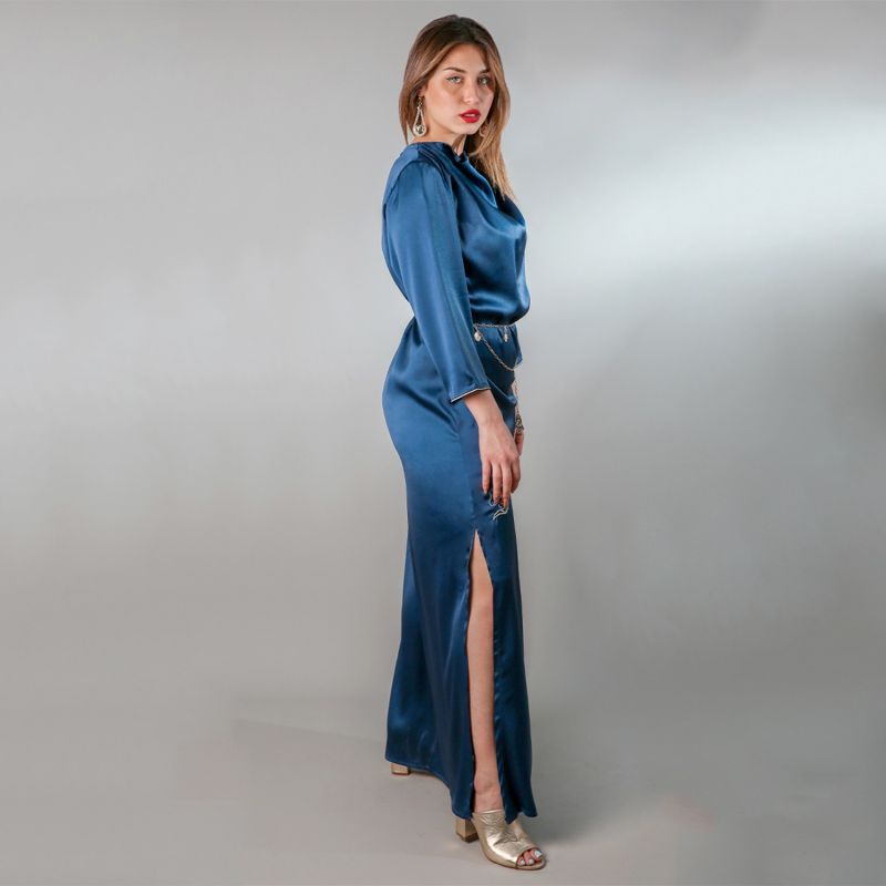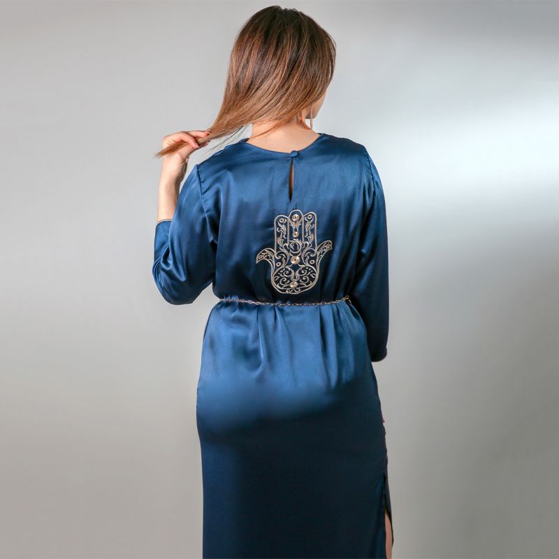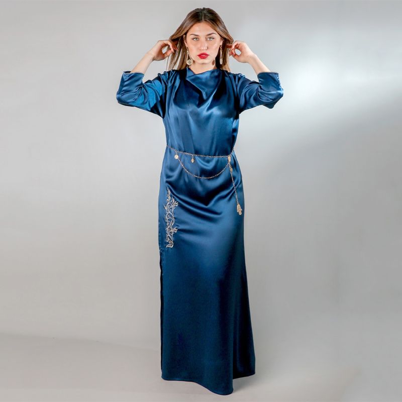 Cette robe hôtesse en satin de soie "Élégance Orientale" est parfaite pour les soirées en famille durant le Ramadan. La robe longue légèrement évasée avec un col bénitier légèrement montant donne un effet très chic. La fente sur le côté ajoute une touche de sensualité à la tenue. La robe comporte deux broderies, une khamssa brodée sur le dos et une jolie broderie en forme de branche sur la fente au fil d’or. La robe est surmontée d'une chaîne à la taille parsemée de pendentifs. Avec notre robe "Élégance Orientale", profitez des soirées en famille avec élégance et confort !